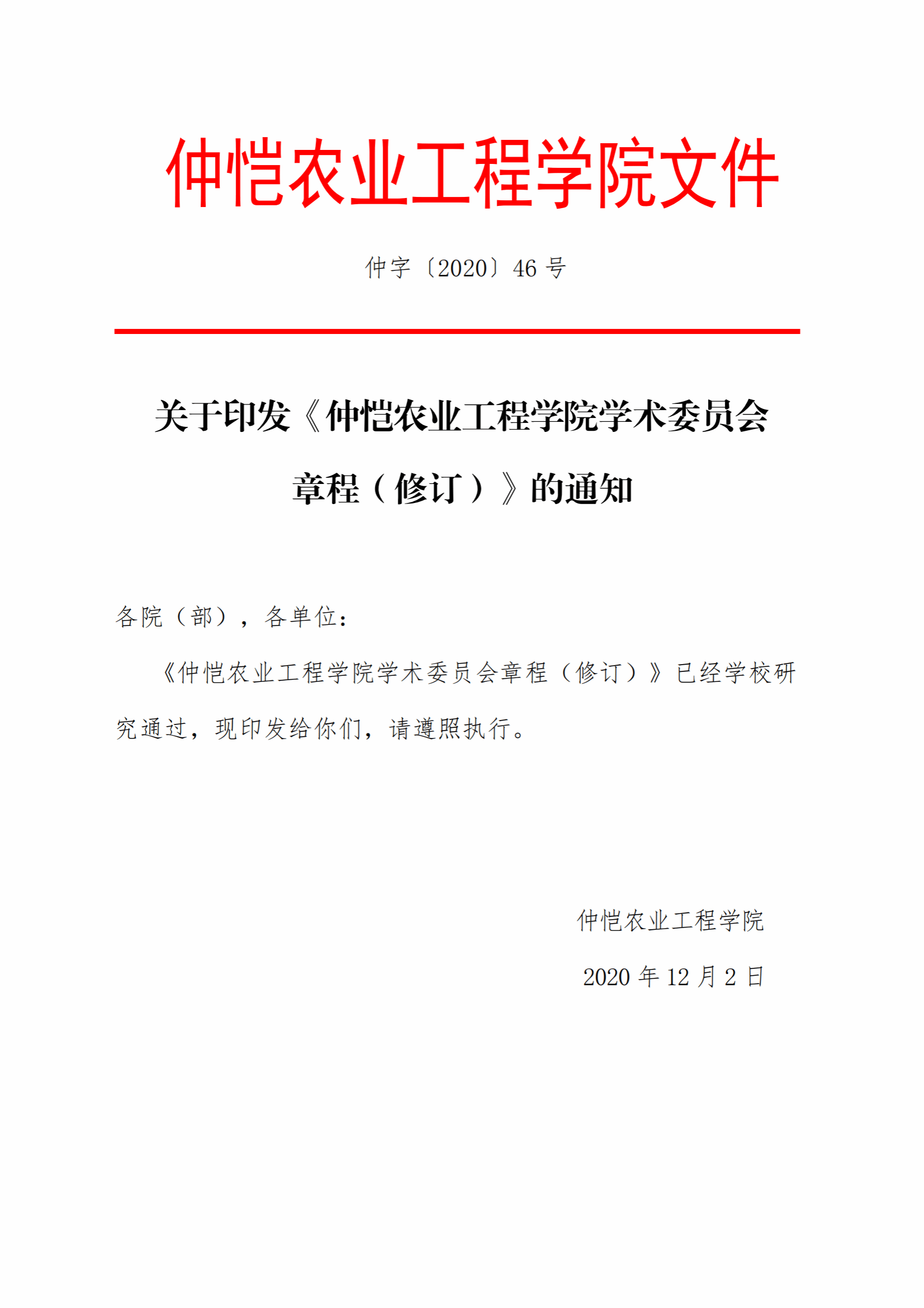 仲字〔2020〕46 号,关于印发《仲恺农业工程学院学术委员会章程(修订)》的通知